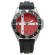 Le drapeau rouge et blanc du Danemark, ou Dannebrog, a une croix nordique ou scandinave. Le rouge est l'arrière - plan, la croix est en blanc. Le drapeau danois apparaît ici sur une montre aux chiffres noirs. La montre montrée est une montre pour homme, mais vous pouvez transférer le design à la montre pour femme et/ou à la montre pour enfant.