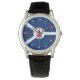 Montre avec le drapeau de la ville de Fort Wayne, Indiana; drapeau bleu et blanc et avec le blockhouse rouge au centre et trois illustrations dans le champ bleu - illustration de la tête des Amérindiens, fleur de lys français et lion britannique