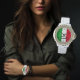 Une montre élégante pour femmes en émail blanc et croustillant, ornée de strass. Le visage de la montre présente les couleurs vives du drapeau italien - vert, blanc et rouge. Pour le rendre unique, votre nom est écrit avec audace en lettres noires. C'est un accessoire chic et personnalisé qui combine sans effort la mode et l'individualité.