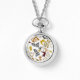 Reloj collar plateado en blanco con elementos botánicos y formas abstractas, donde los elfos y sus máscaras se mezclan entre el aleteo de las mariposas.