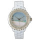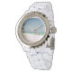 Cette montre en émail blanc pour dames est conçue avec ma photo de Seven Mile Beach, Grand Cayman et des strass autour du visage.
