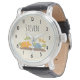 Une montre au design mignon avec 4 dinosaures. 2 volent et 2 sont au sol. Créé avec des aquarelles.