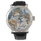 A beautifully crafted watch features Santa Claus dressed in ornate gold and white robes, seated beside a serene reindeer.
