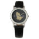 Montre pour femmes montrée avec un visage noir et une bracelet noire avec des mains religieuses d'impression de prière et de texte de foi. Customisez cette montre ou achetez tel quel.