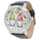 A charming and vibrant digital illustration featuring two cute garden gnomes surrounded by a lush spring scene. The gnomes, one wearing a tall lime green hat and the other a bright red hat, stand side-by-side with long white beards. They are accompanied by four colorful tropical parrots perched on cherry blossom branches. The composition is framed by bright pink tulips and delicate spring greenery against a clean white background.
