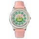 Kawaii cartoon of a frog with sparkling eyes and a crown on its head. The frog prince is sitting on a lily pad in the pond looking upwards with a heart around its head . The clock face numbers are uniquely placed on lily pads to tie in with the whole theme. This adorable and colorful design makes it facactive for kids. Design par Rusty Doodle.