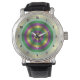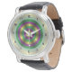 Si vous aimez Mardi Gras, ce design vous conviendra parfaitement. Il présente des tons verts, dorés et violets disposés en anneaux du noir à la lumière qui donnent au cercle un aspect 3D. Cette montre est disponible dans une variété de tailles et de styles, y compris la taille des enfants et des adultes.