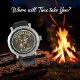 This unique wall clock features an old man with a solemn expression, holding a lit lantern as if peeking through a broken wooden door. The clock face is integrated into this scene, with the words "IT'S TOO LATE" and "TO COME.." prominently displayed, creating a mysterious and somewhat foreboding atmosphere.