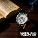 Une représentation époustouflante de Jésus crucifié sur la croix, représenté dans une couleur dorée brillante. La figure est solennelle et expressive, montrant une imagerie puissante associée au sacrifice et à la rédemption.