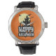 Happy Halloween design de texte illustration avec maison hantée, cimetière et chauves-souris décoration à pleine lune sur grunge orange arrière - plan
