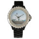Ce dessin présente un phare blanc, vert et noir qui surplombe la mer. Le ciel est bleu avec quelques nuages. Des maisons blanches aux toits verts entourent le phare. Ce design est disponible sur les montres femmes, hommes et enfants.
