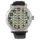 Cette montre pour hommes a un design moderne du milieu du siècle de cercles blancs "déformés" reliés à des lignes noires sur un champ de bandes vertes, orange, turquoise et or. Si vous aimez le design mais préférez différentes couleurs, envoyez-moi un message.