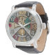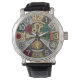 Montre Lion fascinant avec : strass brillant, or, argent mélangé ensemble dans vintage industriel, Stylo montre Steampunk avec de grands nombres facilement visibles. Le design original du visage de montre recouvert d'or, de diamants, d'émeraudes, de pierres de gemme de rubis comprennent des signes zodiaques astrologiques de Lion. (horloger l'arrière - plan est imprimé / ne contient pas de gemmes réelles).