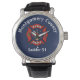 Design élégant pour les pompiers et leurs familles, avec le logo rouge générique du service d'incendie sur arrière - plan bleu foncé. Personnaliser avec les détails du département de la ville ou du comté ou le nom du pompier dans la police blanche moderne