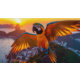 Belle montre Macaw avec un joli perroquet qui tourne de joie au-dessus de Rio de Janeiro au coucher du soleil. Que le bonheur de l'oiseau se répande dans votre vie. Couleur du monde ! !