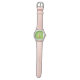 Personnalisez en ajoutant votre nom à cette mignonne montre à bracelet en peinture à l'huile avec une petite fille aux cheveux blonds portant une paire frileuse de fleurs de bébé rousses roses et des chaussures rouges avec un bouquet de joli fleur sauvage oubliez-moi non derrière son dos contre et arrière - plan vert printemps.