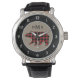 Voici une montre amusante et branchée qui est aussi attrayante ! Au centre se trouve un ours en silhouette rouge et noir de buffle. Au-dessus de l'image de l'ours se trouve votre monogramme de trois lettres en noir. L'image est placée sur un arrière - plan clair, qui est entouré d'un cercle noir avec des chiffres blancs, ce qui rend la montre facile à lire.