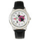Adorable image de coccinelle rose chaud et de fleurs qui se trouve sur un arrière - plan de pois sur la montre de cet enfant. Personnalisez avec votre propre monogramme dans l'éditeur de texte Zazzle facile et choisissez votre style de visages et de bandeaux. Police blanche.