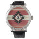 Aztec ethnic bohemian pattern with geometrical shapes in red, orange, grey and black colors on striped background