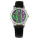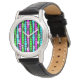 Cette montre a un design moderne du milieu du siècle de neon rose, vert, et bleu rectangles arrondies en taille croissante et décroissante en courant verticalement sur un champ de noir.