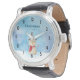 Montre moderne avec une jolie illustration de bonhomme de neige. Il porte un casquette de fourche noir, tient une pipe à base de maïs classique et porte une écharpe rouge. Debout dans la neige blanche et froide, souriant et saluant. L'arrière - plan est composé d'un ciel d'aquarelle aux couleurs bleu et violet se mélangeant. Texte personnalisable dit Noël Time.