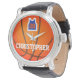 C'est une montre à thème de basket vraiment facile à customiser, pour ce modèle vous n'avez qu'à ajouter le nom. Il s'agit d'un grand cadeau personnalisé pour les anniversaires, la remise des diplômes, Noël, vacances, comme un cadeau d'appréciation, et pour toute occasion spéciale en général. Eléments sur la composition design, basket-ball, couleurs orange noir et blanc, lettrage calligraphie.