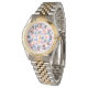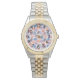 Cette montre pour femmes a un design du milieu du siècle des ovales concentriques et des moitiés ovales fanées éparpillées sur le design.
