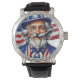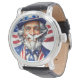 Oncle souriant Sam USA American Icon portant un costume américain et un drapeau américain agitant en arrière - plan