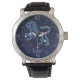 Montre avec le symbole zodiaque pour Léo en bleu argenté doux, recouvert d'étoiles de la constellation, contre un arrière - plan étoilé du bleu profond de minuit au noir.