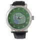 Un joli paon de dessin animé vert regardé par de nombreux yeux sur sa queue. Quel oiseau drôle et beau !