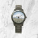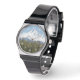 Élégante montre au poignet pour hommes avec des chiffres blancs qui présente une photo pittoresque du mont Hood enneigé surplombant des vergers fruitiers dans la vallée. Sélectionnez votre montre dans plusieurs styles.