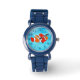 Montre de poisson clown visage avec bande noire et anneau de nombres par incréments de 5 pour aider un enfant à apprendre à dire l'heure. Les mains disent, "heure" et "minute" sur ce style, qui est facile à changer, et choisir une couleur dans la large sélection. L'arrière - plan bleu océan a des chiffres noirs autour du bord.