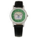 Un dessin au crayon couleur d'un tas d'or dans un pot de haricot décoré de shamrocks couleur cobalt et d'un trèfle à quatre feuilles ornent cette montre chanceuse !