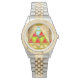 Le visage de cette montre est revêtu d'une pyramide rouge, chartreuse et bleu clair et de chiffres en or. Disponible dans les styles masculin, féminin et pour enfants.