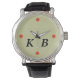Un look rétro avec quatre points rouges, qui ont l'air en trois dimensions, aux positions 12, 3, 6 et 9. En bas du centre de la face, personnalisez avec deux initiales qui auront des ombres déroulantes. Customisez/Modifiez la couleur de l'arrière - plan à votre goût.