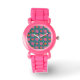 Une jolie montre à bracelet Parties scintillant rose pour enfants, avec un motif coloré de Fleurs rouges et roses et de Pois jaunes sur un Arrière - plan bleu profond et vert. Faisant partie de la collection Posh & Painterly 'Rangoli', ce motif peut être ajusté pour s'adapter à n'importe quel Wristwatch.
