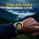 Cette oeuvre présente une représentation dorée de Jésus-Christ, Ses mains élevées dans un geste de bénédiction. Une colombe flotte au-dessus de Lui, symbolisant la paix et le Saint-Esprit. La figure rayonnante est entourée de robes fluides, soulignant sa présence divine.