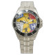 Un collage de panneaux lumineux en or, rouge, bleu et blanc font une montre unique et funky. Coloré!