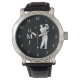 Voici une montre attrayante qui est parfaite pour le fan de golf ! Il dispose d'un golfeur argenté brillant en pleine balançoire au centre, avec son triple monogramme en argent assorti courant verticalement sur le côté gauche. Les chiffres sont aussi en argent, et tout est placé sur un arrière - plan noir dramatique.