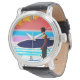 Surveillez un surfeur debout sur la plage, en silhouette contre un arrière - plan semi-abstrait d'eau et un ciel couché de soleil