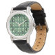 Cette montre pour femmes a un design géométrique fait de Ls dans les tons verts, dans des directions différentes qui se répètent à travers le design.