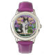 Un mignon chat bicolore noir et blanc, European Shorthair, assis sur une chaise en bois devant des fleurs de jardin violet. Photo Katho Menden. Cette montre est une idée cadeau pour les amoureux de les chats.