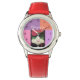 Ce magnifique chat Tuxedo orné de fleur rouge sur la tête et d'un ruban look magnifique dans cette jolie montre girly. Vous pouvez le customiser en ajoutant votre pseudonyme ou votre nom. Cela pourrait être l'une des meilleures montres de poignet de chat que vous verrez jamais. Si vous ne trouvez pas ce que vous voulez, envoyez-moi un email à jraym48@gmail.com alors je ferai un nouveau design que vous aimez. Copyright ©Jude Maceren artiste.