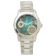 Bijoux, montre en or avec chaîne d'or et clés sur un arrière - plan texturé vert. Style Steampunk.