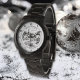 This elegant black-and-white Christmas watch features a beautifully illustrated winter village, evoking the quiet charm of a storybook scene. Delicate linework captures snow-covered rooftops, pine trees, and a winding stream beneath a stone bridge, all bathed in a soft, vintage glow. A slender church steeple watches over cozy cottages, while distant mountains fade into a dreamy horizon. The design is airy and serene, inviting warmth and nostalgia. On top of the illustration , you can personalize the “Merry Christmas” message and the sender name(s) or message at the bottom.