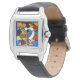 Montre à poignet en cuir noir carré parfaite pour femmes avec une image en vitrail de la divinité Kokopelli. Kokopelli est un dieu de la fertilité, habituellement décrit comme un joueur de flûte à épaulettes (souvent avec des plumes ou des protrusions à l'antenne sur la tête), qui a été vénéré par certaines cultures amérindiennes du sud-ouest des États-Unis. Comme la plupart des déités de fertilité, Kokopelli préside à la fois l'accouchement et l'agriculture. Il est aussi un dieu tricheur et représente l'esprit de la musique. Voir bouton correspondant, charme, grand porte - clé carré haut de gamme, porte - clé acrylique carré et collier. Voir l'ensemble de la collection Arizona Watch dans la section ACCESSORIES.