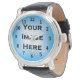 Pour customiser ce produit, téléchargez votre propre image ou photo arrière - plan comme indiqué ci-dessus. Ce modèle de montre personnalisé est une conception simple, polyvalente et classique de la montre avec des chiffres noirs surlignés qui indiquent l'heure. Les bords blancs fins (2px) font que les chiffres se démarquent bien par rapport à une grande variété de couleurs et de textures arrière - plans.