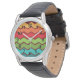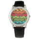 Cette montre a un design des années 1970 de lignes de zigzag en jaune, orange, rouge, vert et bleu sur un champ de brun.