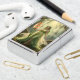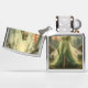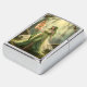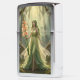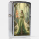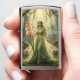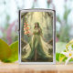 Een mooie fee met een vloeiende lichtgroene jurk en sieraden gemaakt van peridots met peridotstenen in haar lange lichtgroene haar en doorschijnende libel-achtige vleugels met een gladiool wandelingen in een magisch bos omringd door roze en blauwe bloemen en met wijnstokken bedekte bomen.
