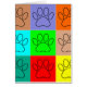 Een leuk patroon van zwarte hondenpootafdrukken in vierkanten van verschillende kleuren.